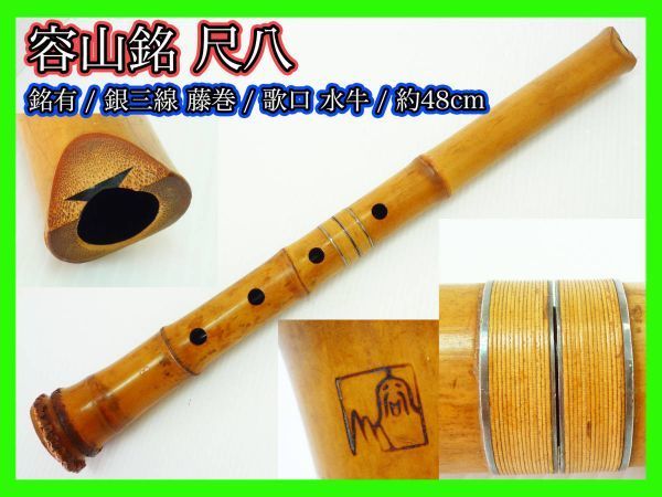 > 必見 容山 銘有 尺八 銀継 藤巻 銀三線巻 歌口水牛 刻印 在銘 約48cm 中継 竹製 内部漆 伝統 狂言 雅楽 能 和楽器 旧家蔵出 マニア _S2