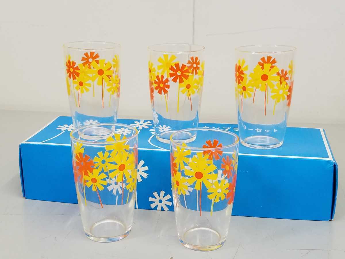 > 【未使用】 昭和レトロ 花柄グラス 5客セット 高さ約10.5cm 箱入り レトロポップ コップ オレンジ グラス ガラス タンブラー