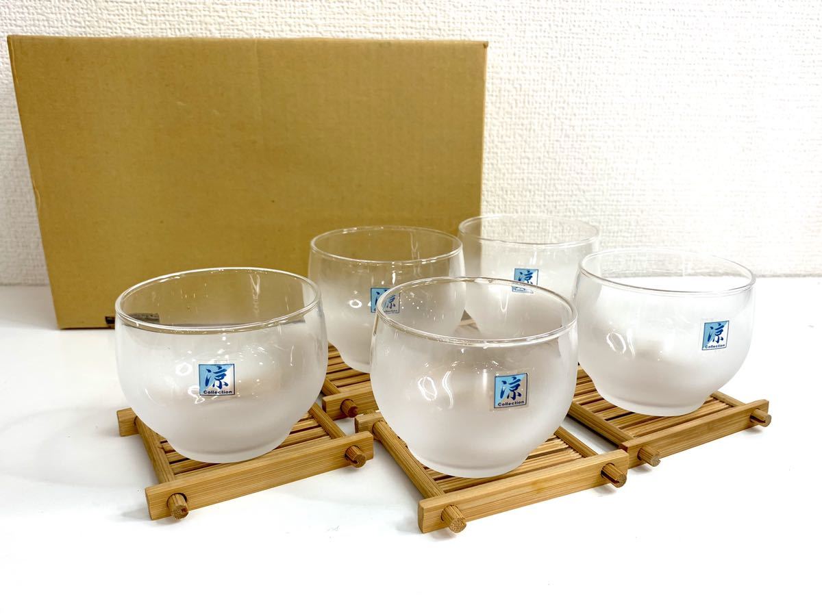 - 未使用品▼涼コレクション 冷茶グラス 曇りガラス 茶托付き 5客セット 箱あり 管理2105 K-11