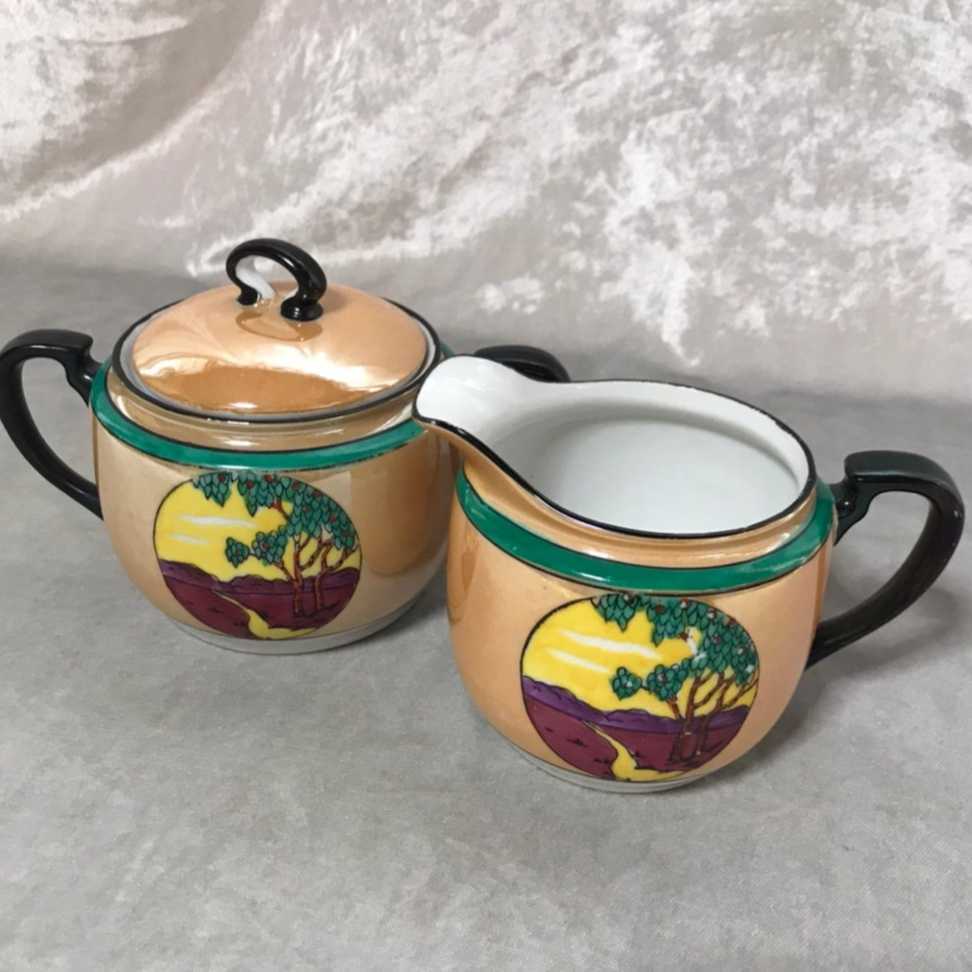 - 【陶磁器】オールドノリタケ ラスター彩シュガー&ミルクポット 里帰り陶磁器 アルーデコシリーズ 風景柄 刻印あり 骨董品 アンティーク