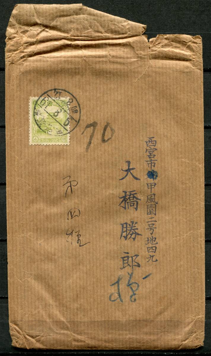 - 満州切手 エンタイヤ [新京中央/9.8.19] 満州切手4次普通4分貼 z11566