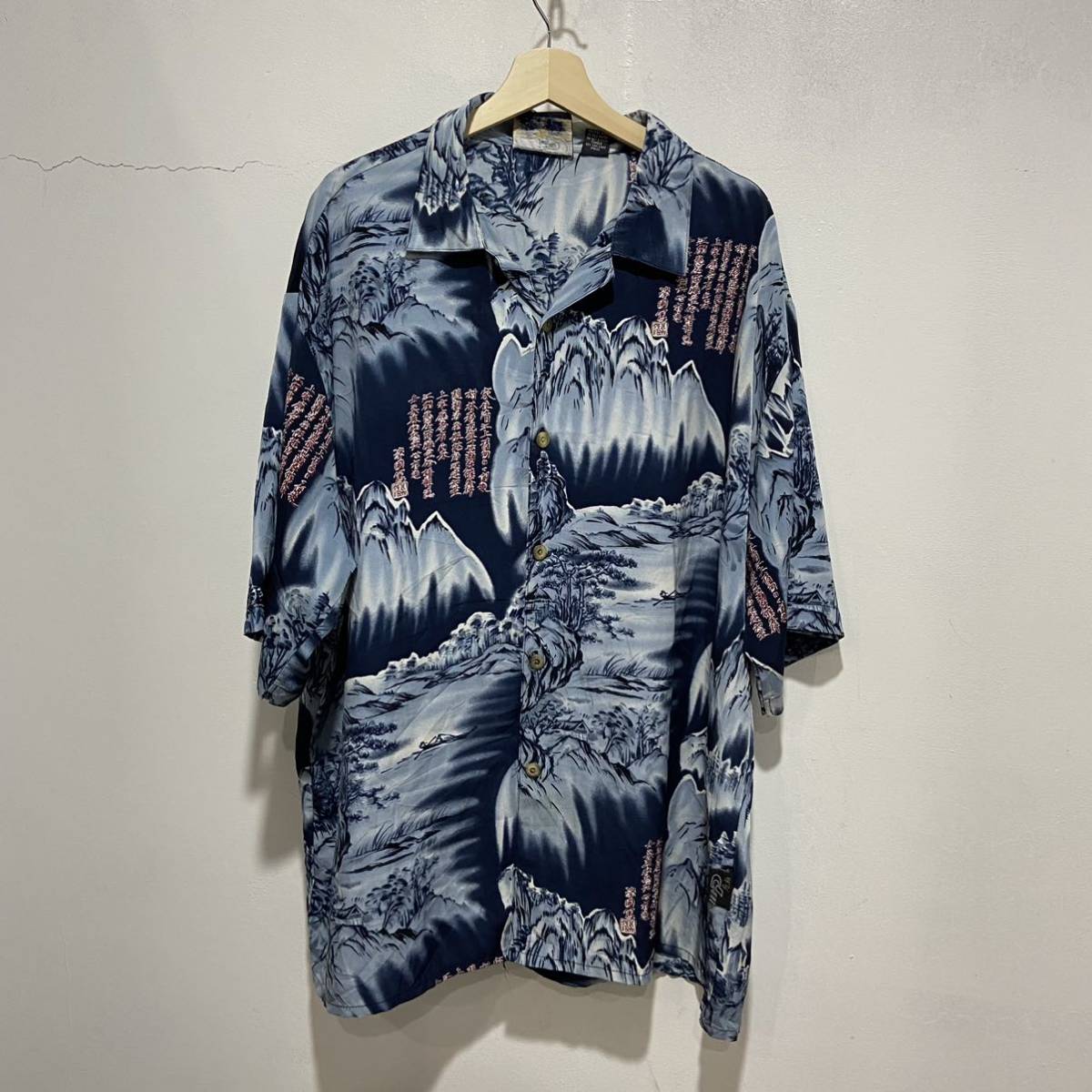 - ☆送料無料☆90s☆総柄ポリシャツ☆チャイニーズアート☆漢字漢文☆オープンカラー☆3XL