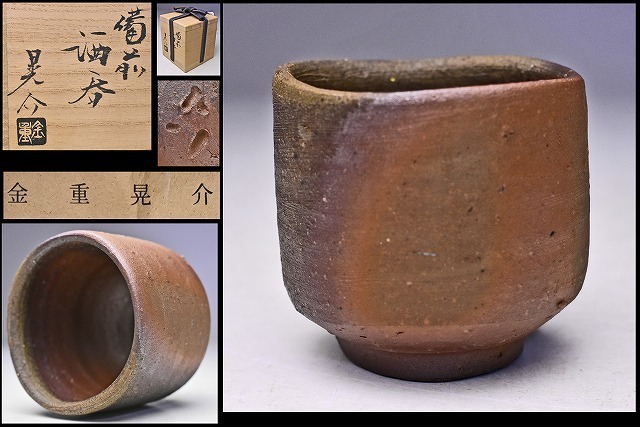 > 金重晃介 ★ 備前 ぐい呑 ★ 共箱 栞 ★父:人間国宝 金重陶陽 ★ 土味良く牡丹餅風の景色に味わいのある逸品 ★検 金重道明 ★