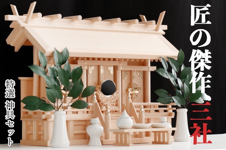 - 匠造り■職人が仕上げる 極上 木曽桧の神棚■板葺き厚屋根 傑作三社 通し屋根■中■神棚セット■特選 神具セット