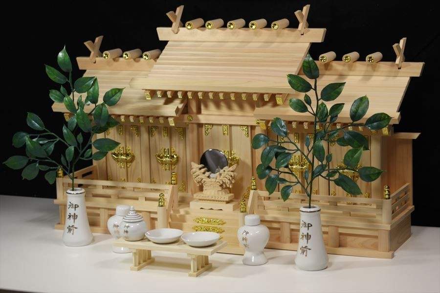 - 五社■屋根違 省スペース型 幅74cm■神具セット付 神棚■限定数