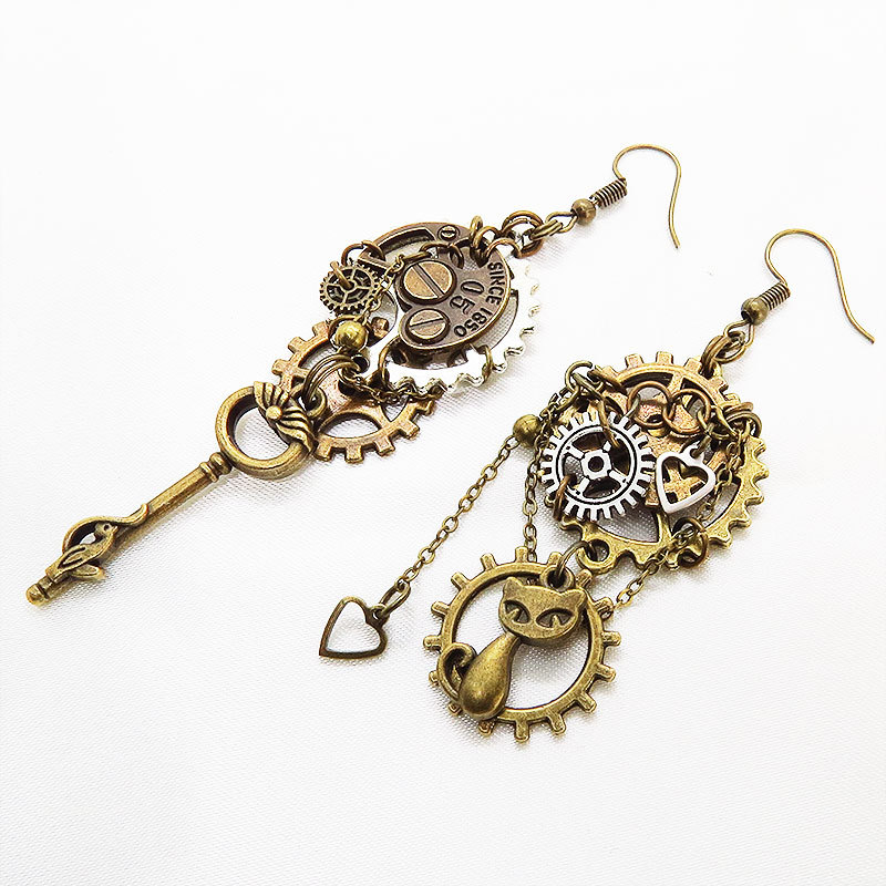 - 猫と鍵と歯車・ギアのスチームパンク風アシンメトリー ピアス Vol3 シルバー&アンティークカラー 金古美