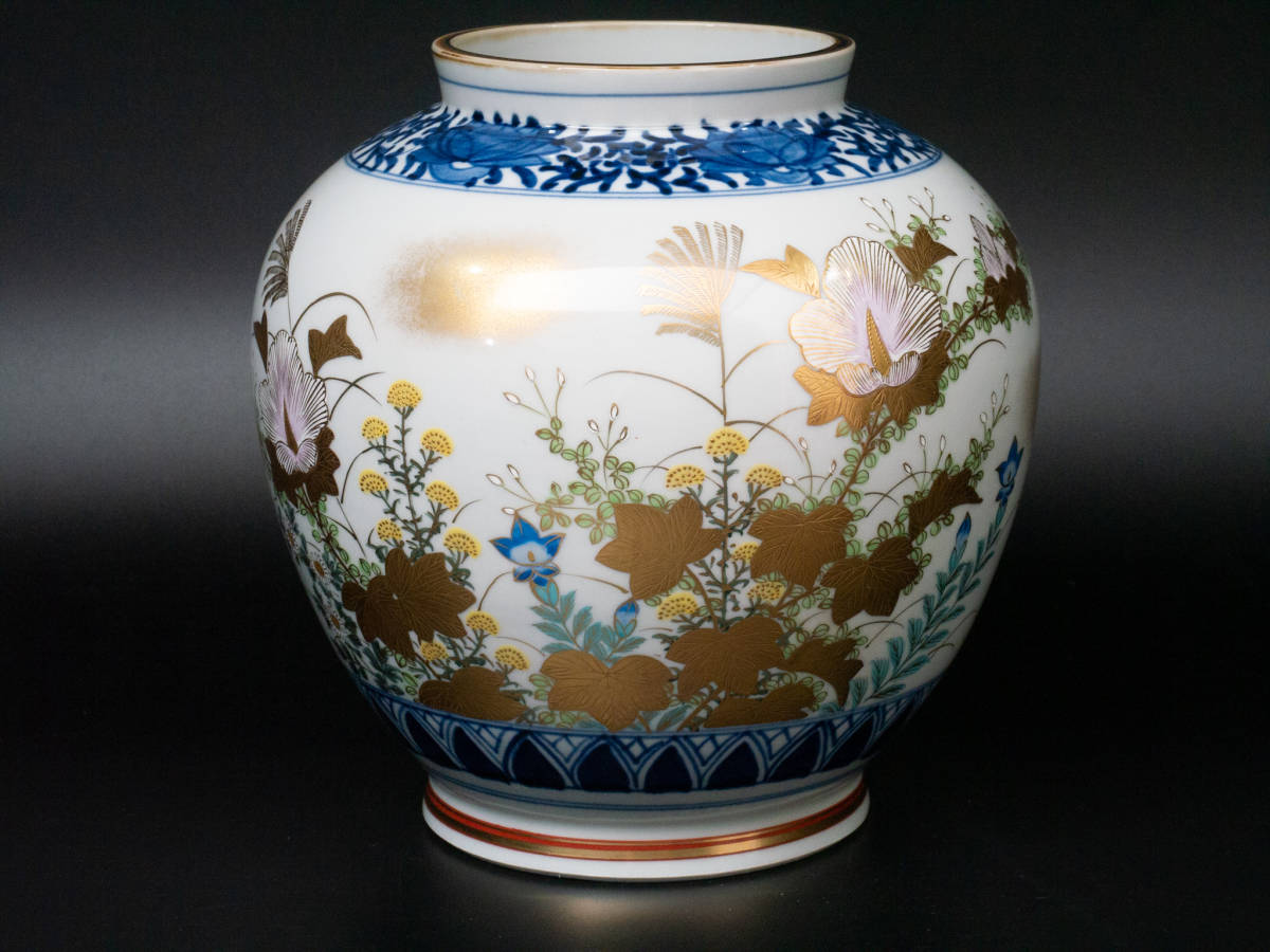 - 【値下げ交渉有り】 九谷 名工 仲田錦玉 造 染付 色絵 金彩 秋草模様 花入 花瓶