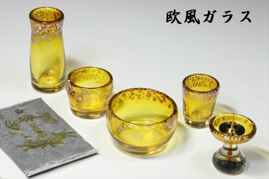 > 国産 仏具 仏具セット ■ 5点セット ミニ 手造り品 ガラスの佛具 イエロー ■ モダン 家具調 仏壇 お供え■ お盆 お彼岸 お墓参り