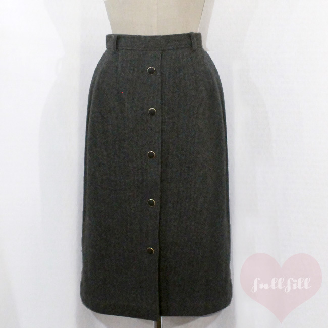 - 古着 スカート リブニット タイトスカート グレー 飾りボタン フェミニン 昭和 レトロ ヴィンテージ ビンテージ 無地 ウールスカート