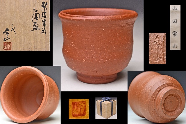 > 山田常山 3代 ★ 梨皮 朱泥 ぐい呑 ★ 共箱 共布 栞 ★ 人間国宝 ★ 土味良く造形の良い逸品 ★ 検 常滑焼 煎茶道具 急須 ★