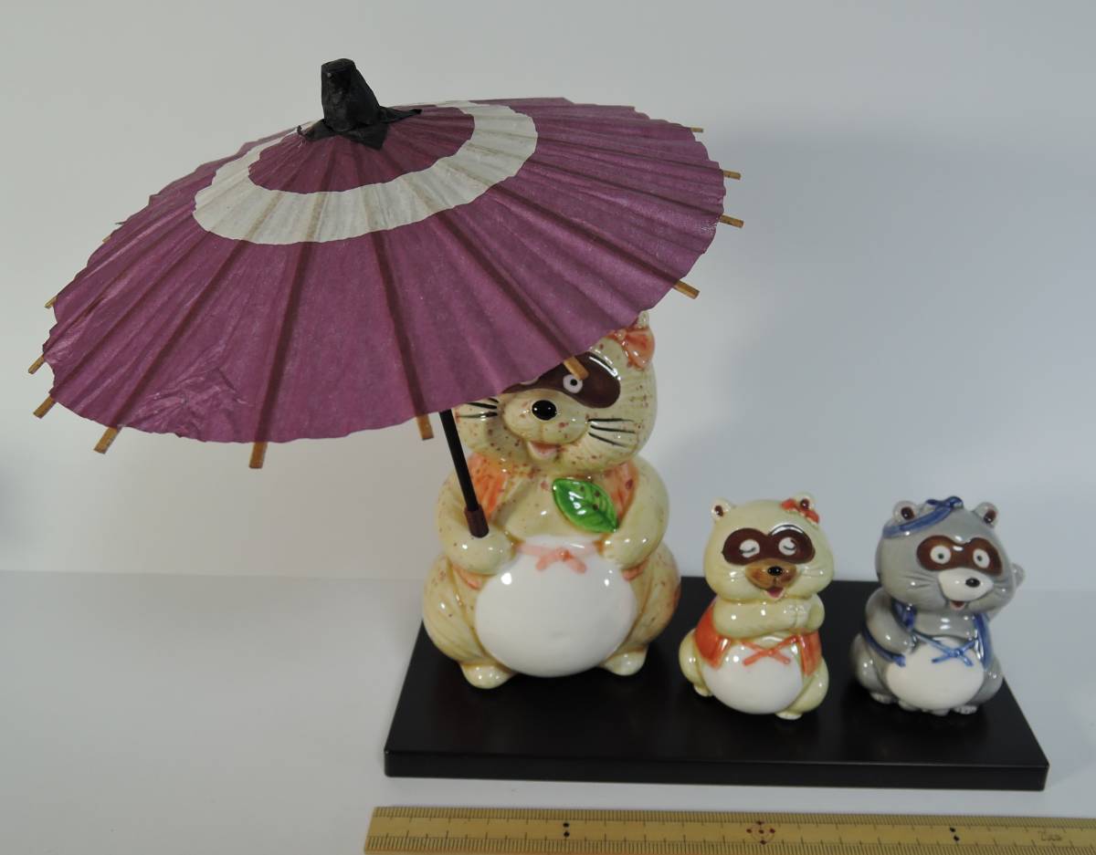 - ☆V09■開運 招福狸 アベック タヌキ 傘を持った狸 貯金箱 陶器製■未使用