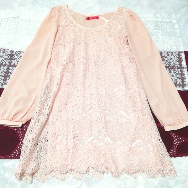 > ピンクレースシフォン長袖チュニックネグリジェ Pink lace chiffon long sleeve tunic negligee dress
