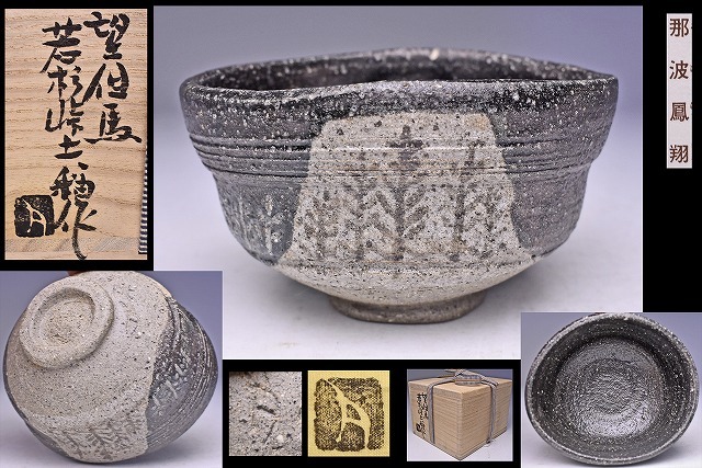 > 那波鳳翔 ★ 黒織部茶碗 ★ 望 但馬 若杉峠 土 使用 ★ 共箱共布栞 ★ 子息に 那波翔英 氏 ★