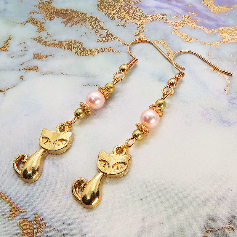 - マットゴールドの猫モチーフとスワロフスキー・パール(ロザリン)を組み合わせた可愛いピアス サージカル可