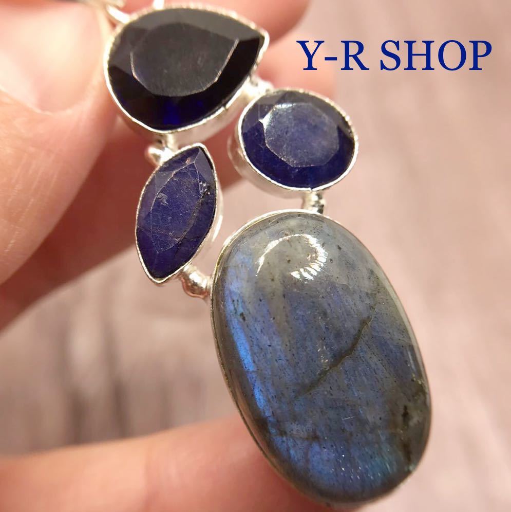 - 天然石★ラブラドライトとサファイアのペンダントトップ ★レディースネックレスシルバー 925刻印カラーストーン 新品宝石インドジュエリー