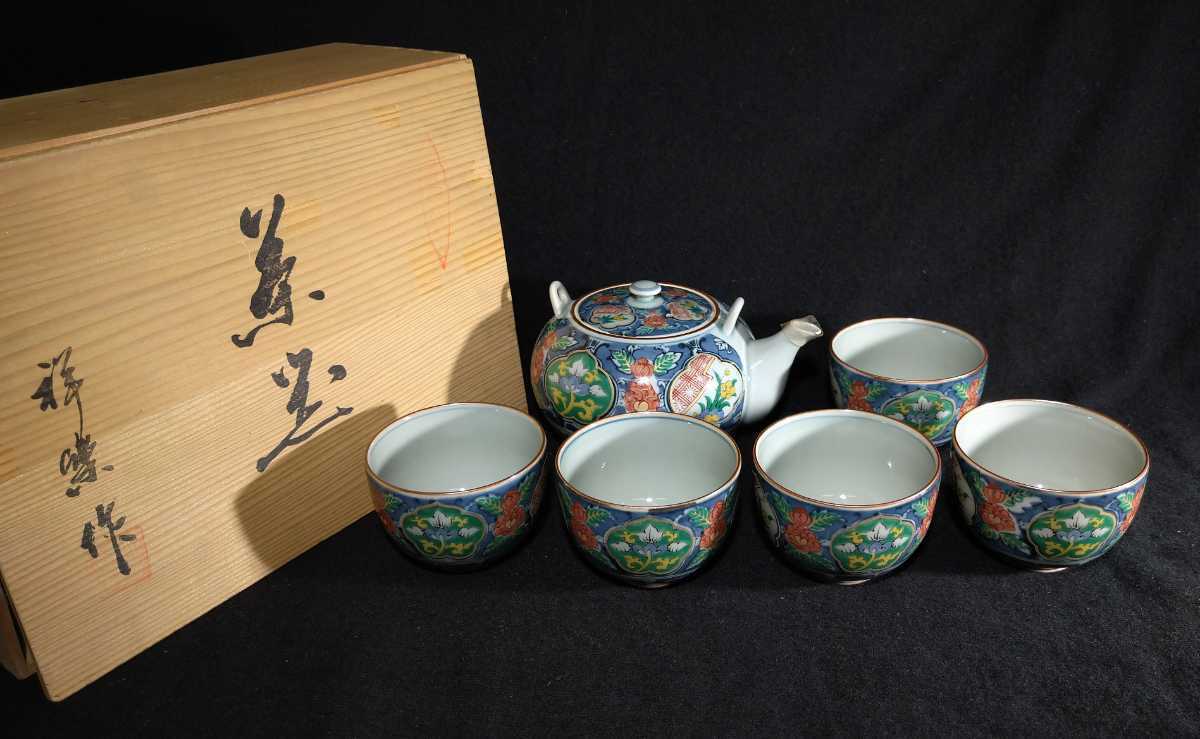 - 祥楽 「茶器」 金彩 色絵 花尽し 急須 湯呑5客揃 共箱 茶器セット 煎茶道具 有田焼 bm-33hg636