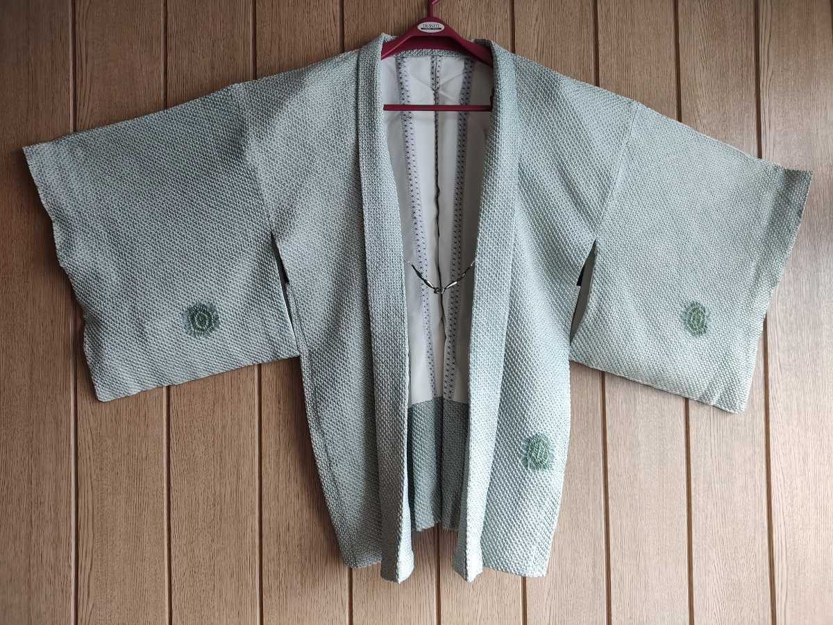 > 中古 昭和 レトロ 羽織 錦紗 絞り 鶯色 石 ストーン 留具 Vintage kinsha silk crepe Kimono coat 着物 シルク 絹 リメイク 生地