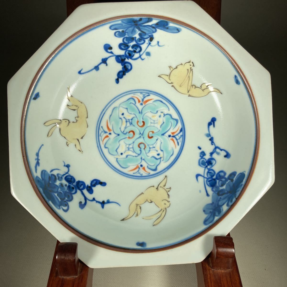 - 宮崎祐輔造 染錦葡萄兎紋様 八角鉢 共箱 888