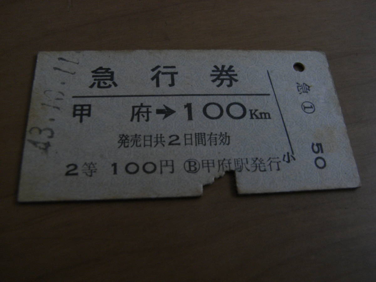 - 急行券 甲府→100km 2等100円 昭和43年10月11日 甲府駅発行