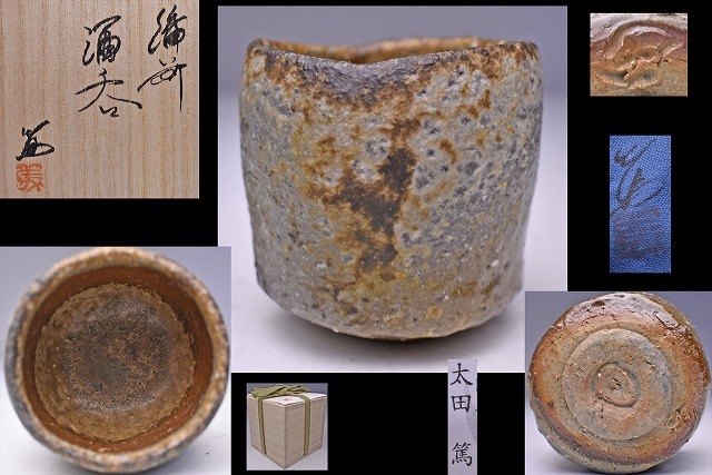 > 太田篤 ★ 備前ぐい呑 ★ 共箱共布栞 ★ 全体的に灰被り ★ 造形良好 ★ 見込みに黄胡麻あり