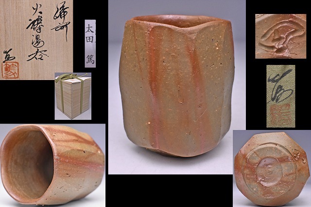 > 太田篤 ★ 備前火襷湯呑 ★ 共箱共布栞 ★ 面取りタイプ ★ 固く焼きしまった質感 ★ 硬質感たっぷり