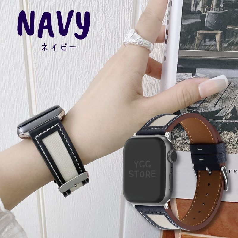 > applewatch キャンバス レザー バンド 38 40 41 42 44 45 49 レディース ネイビー 紺 アップルウォッチ 9 8 7 6 5 4 3 SE SE2 ウルトラ