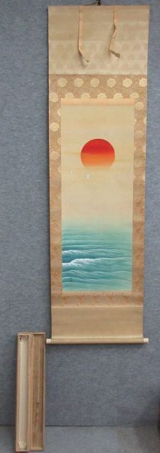 - 【模写】 掛軸 旭日静波 [B30614] 長さ187cm 幅54cm 絹本 翠映 共箱 風景 床の間 飾り 古玩 古美術