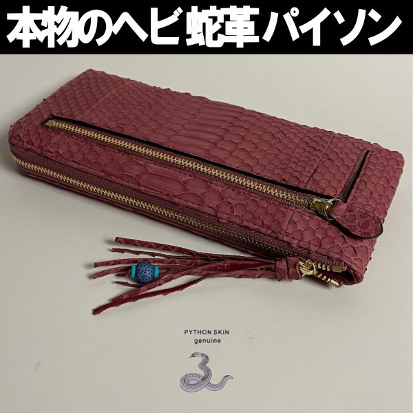 - パイソン 長財布 ヘビ革 L字ラウンドファスナーゴールド ワインレッド