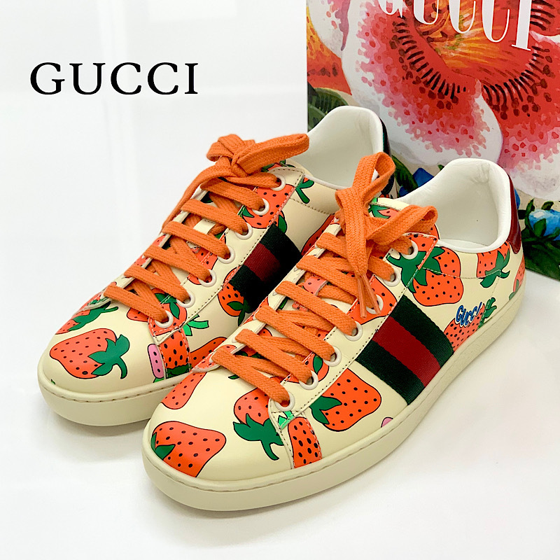 - 4273 未使用 グッチ エース レザー イチゴ スニーカー アイボリー オレンジ
