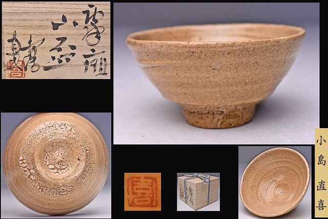 > 小島直喜 ★ 唐津 山盃 ★ 共箱 共布 栞 ★ 枇杷色の肌が良く高台には梅花皮の景色が素晴らしい逸品 ★ 井戸 ぐい呑 ★ 曹源窯 酒器 杯 ★