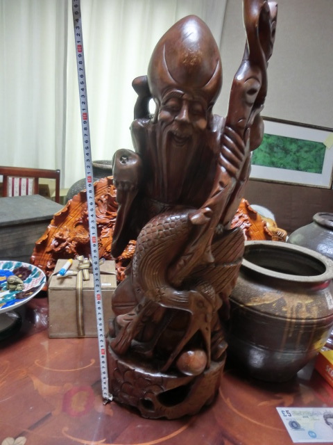 - 木彫 鶴仙人像ですが、東方朔(とうぼうさく)と言うらしいです、手に抱える持ち物が杖と縁起の良い鶴ですからそう思います