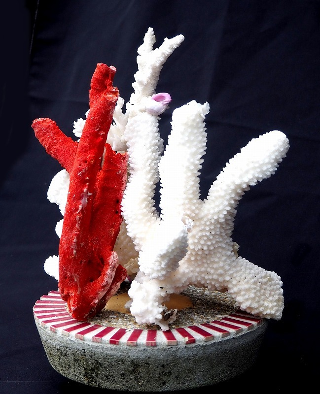 - サンゴ 珊瑚 赤 白原木 3個 台座付 マリン アクア