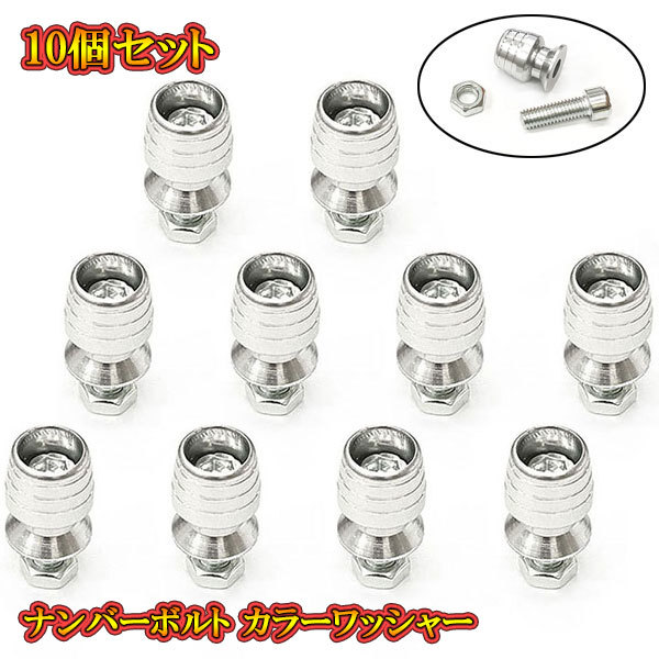 - ナンバープレート ボルト フェンダー グラス型 盗難防止 アルミ カラーワッシャー付 M6 ボルト 10個set シルバー 送料無料