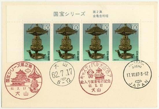 - ★絵入りハト印付ハガキ-26:1987 国宝シリーズ第2集 金亀舎利塔 4連 タイトル部付★(16.05.24)