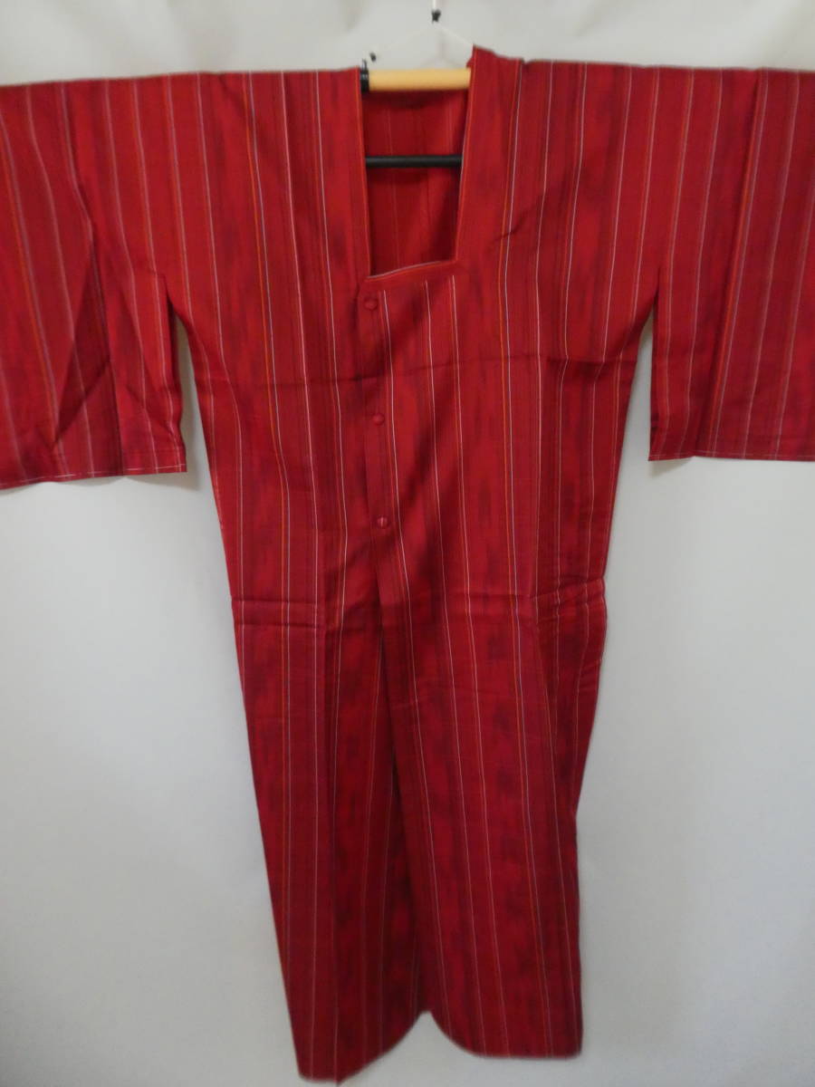 - ⑤和装 道行コート ロング 和服 着物コート しつけ付き 赤 ストライプ 上着 羽織り 外出着
