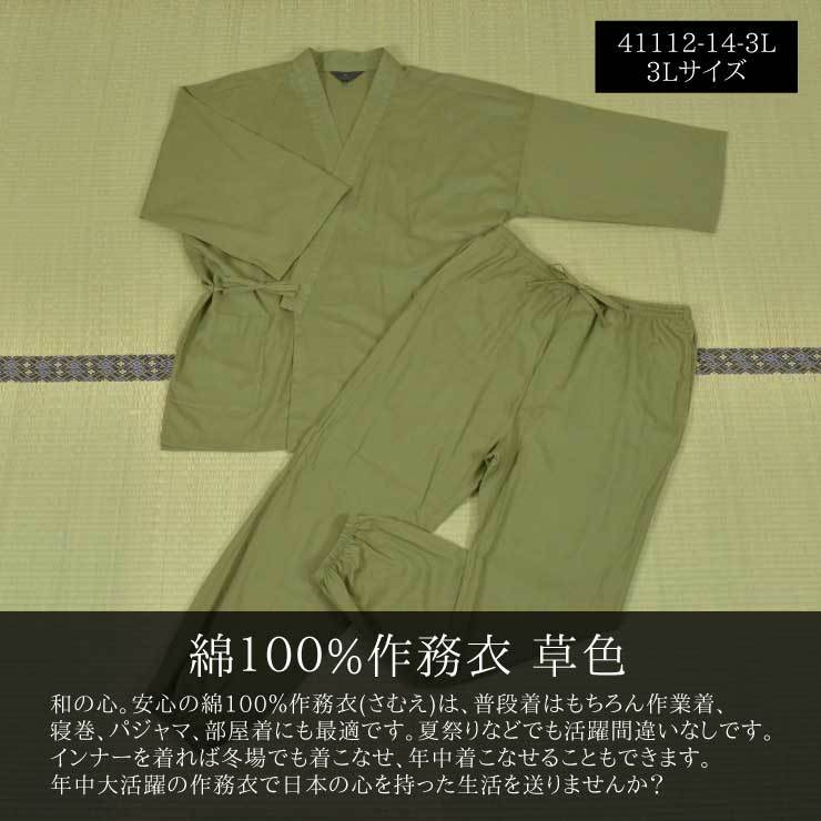 - 綿100% 薄地 作務衣 さむえ 草色 3Lサイズ★41112-14-3L★新品 紳士 男性 おしゃれ パジャマ 普段着 和食 居酒屋 整体 陶芸 書道 和装 Z1