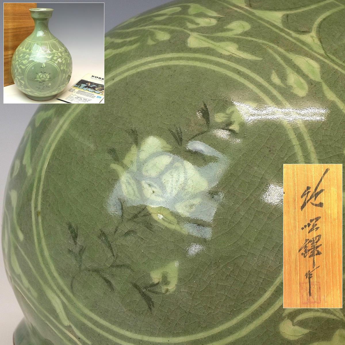 > 【趣楽】 韓国人間国宝 池順鐸作 高麗青磁 草花文花瓶 高さ26,5cm 共箱 本物保証 F1781