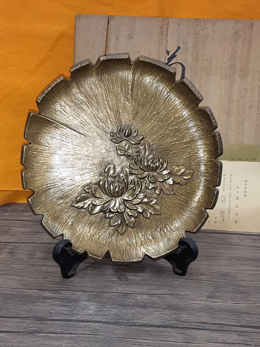 - 秀逸作品 黄銅飾り皿 菊 津田信夫に師事 鋳金作家 津田永寿作