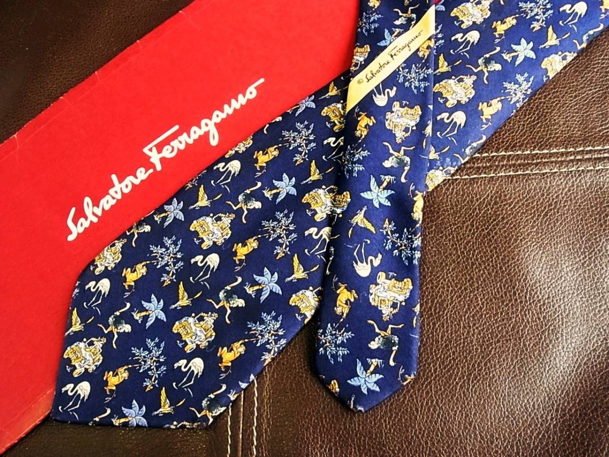 - 【在庫処分セール】5-6686z■フェラガモ【猿・サル・車・自動車・鳥・ダチョウ・】ネクタイ