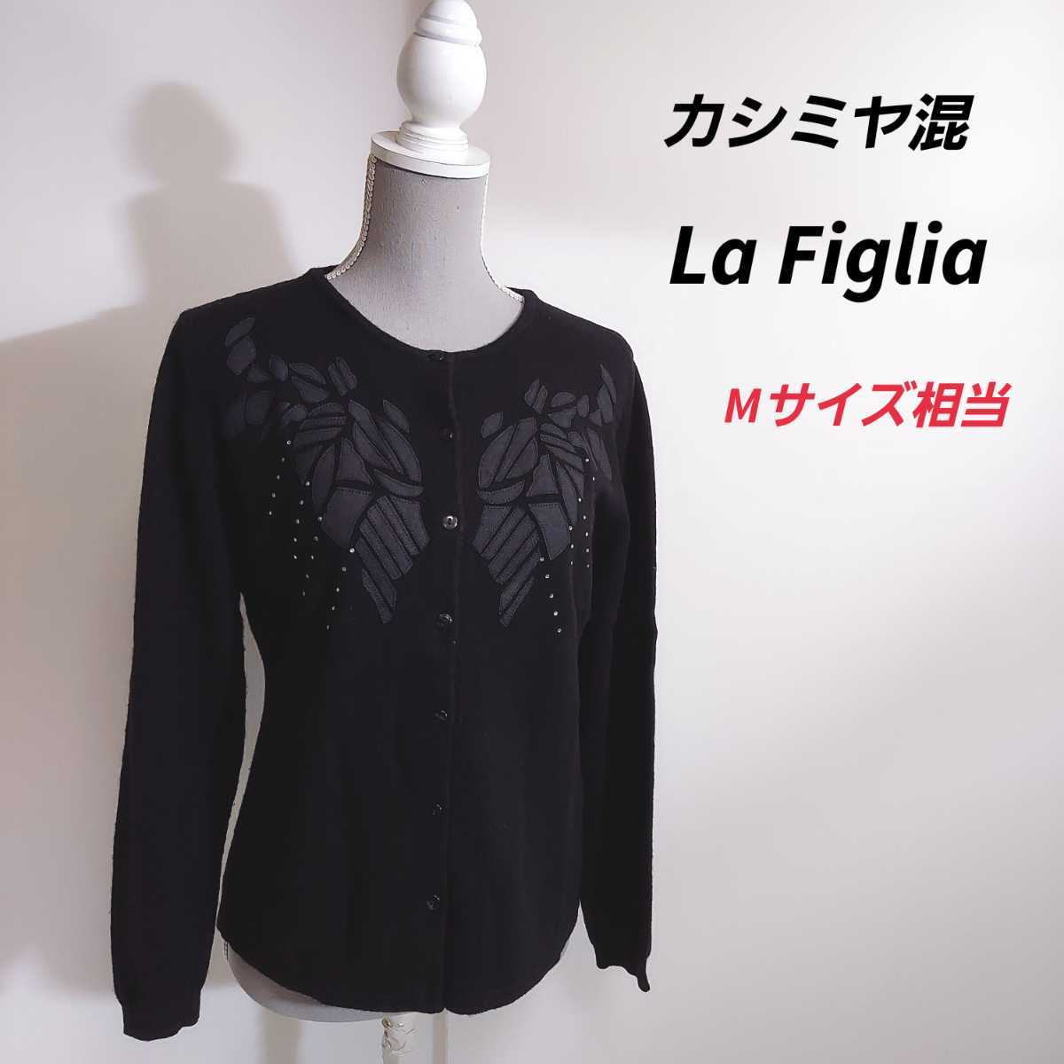 > カシミヤ混 La Figlia ラインストーン飾り ウール素材カーディガン 黒 サイズ表記なし・Mサイズ相当 アリエス カシミア