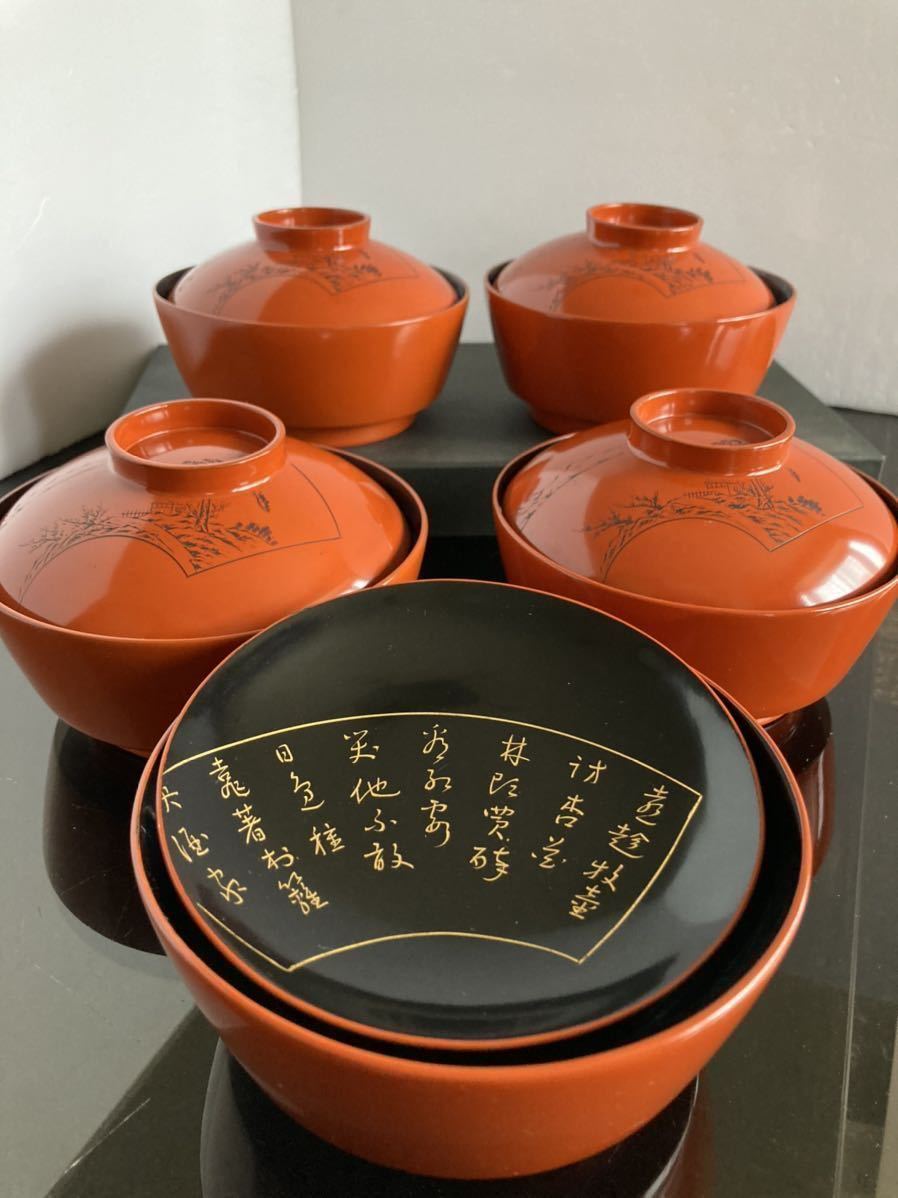 - 極美品◆木地 輪島塗り 朱漆塗 山崖松花堂 山崖兵三郎 蓋付大平椀 5客セット 扇彫図 扇書図 漆器 茶懐石 明治期 旧家蔵出し 骨董