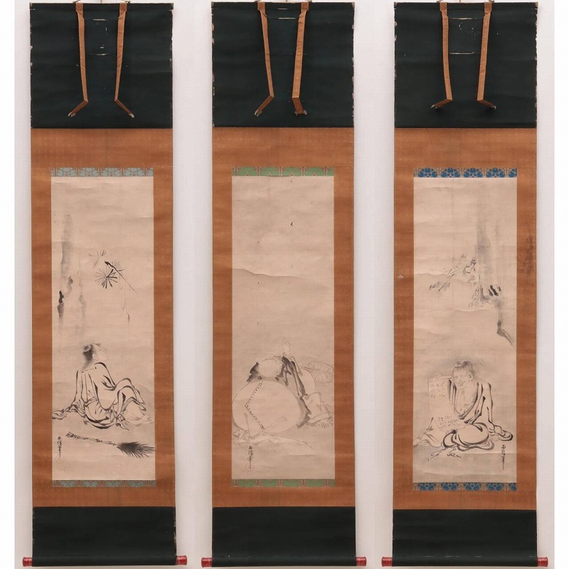 > m30-8113[OTO]【真作】狩野安信 掛軸 紙本 肉筆 水墨 三幅対 落款 印有 合箱 江戸前期 狩野派 英一蝶師 JK00