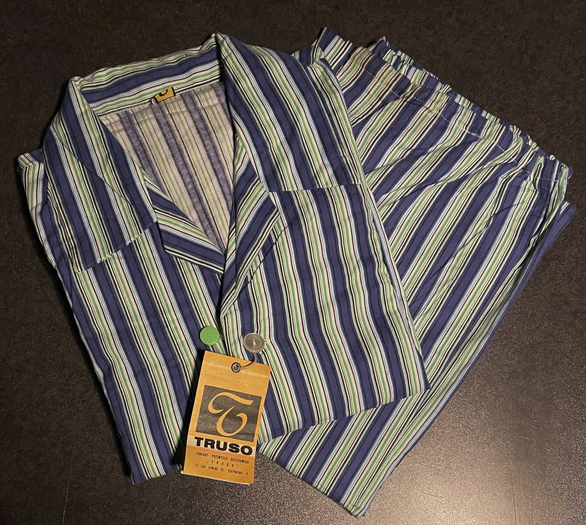 > デッドストック70sビンテージパジャマ/セットアップMストライプ柄コットン紺青/緑白オープンカラーシャツ/イージーパンツ70年代1970sユーロ