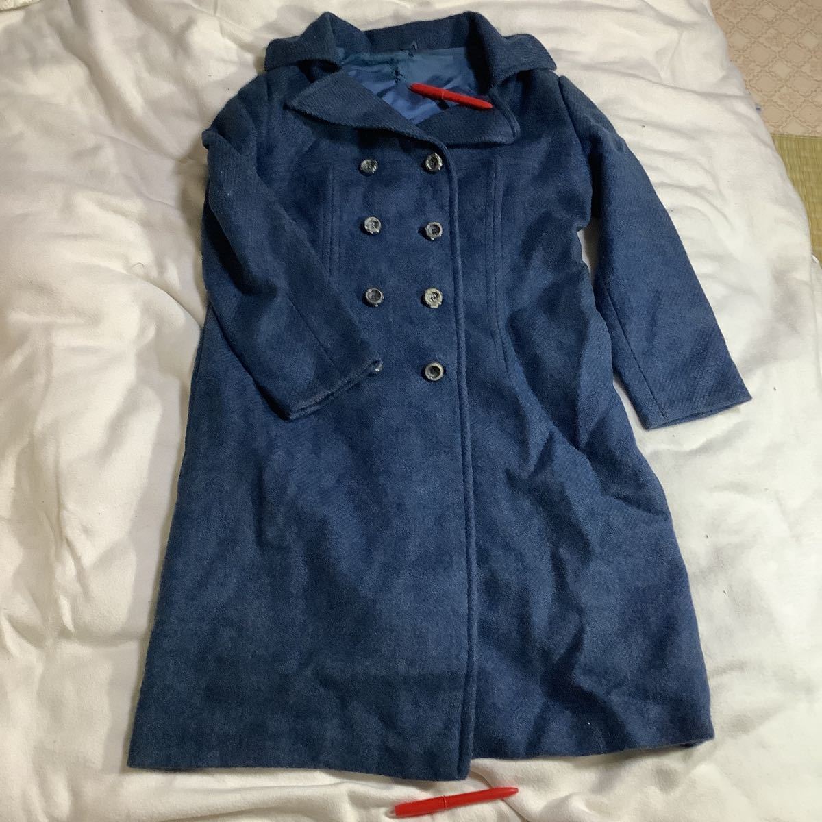 > コート 500円超10%オマケ 身幅50着丈95袖51cm タグ無ウール?ポケ2青 裏地破れ汚れボタン色剥がれ 刺繍名前縫製前=特注? 60