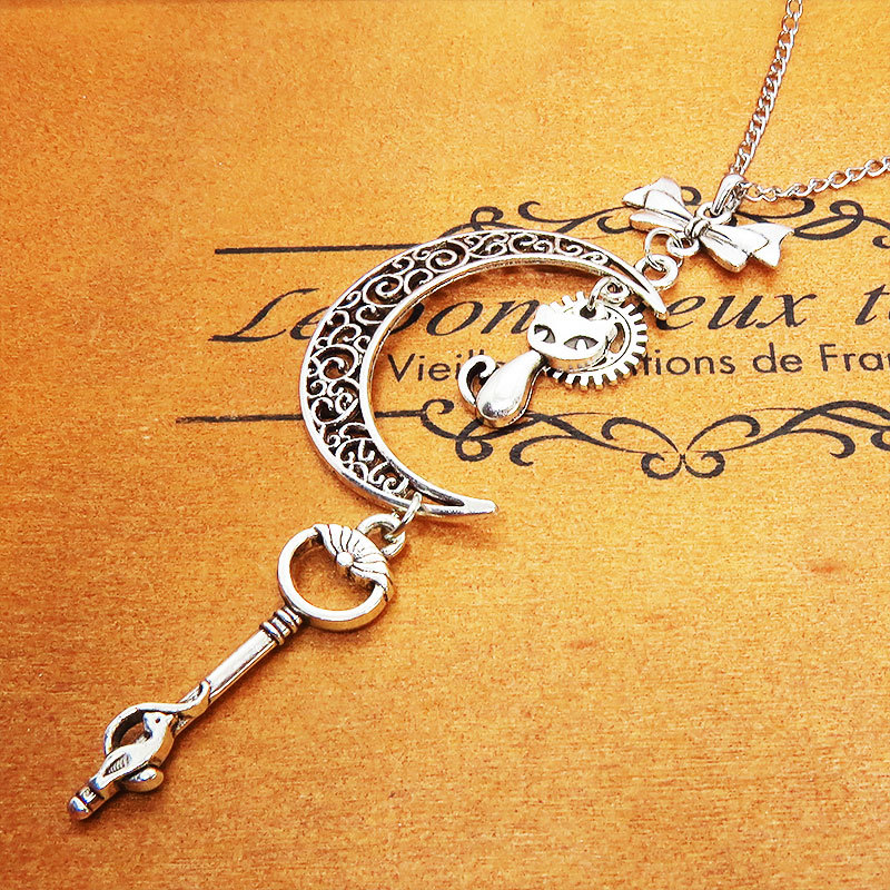 - アンティークシルバー 猫とアラベスク調の透かし三日月を組合せたネックレス ハート 猫つき鍵 ムーン 長さ調整可 アジャスター付
