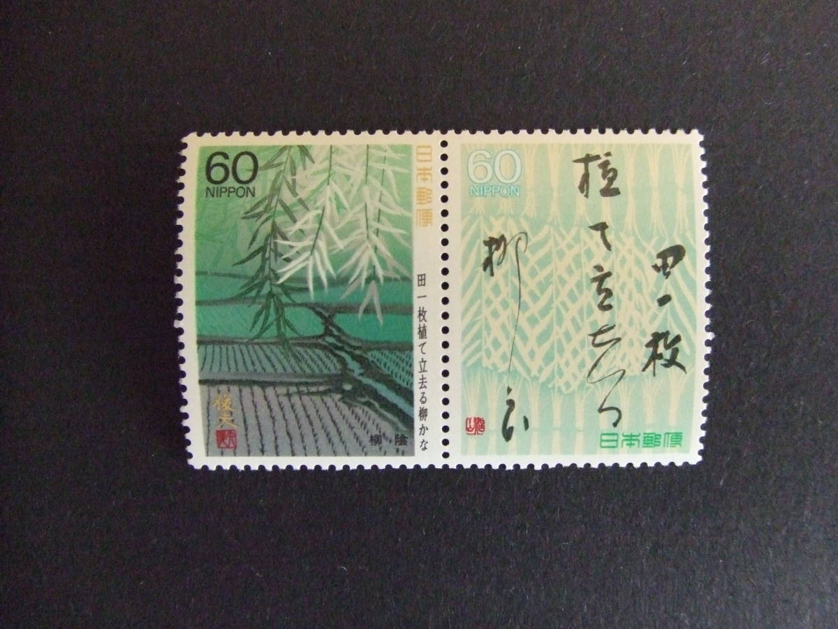 > 日本切手ー未使用 1987年「奥の細道シリーズ」第2集 柳陰 60円ペア1組 片方にヒンジ跡あり