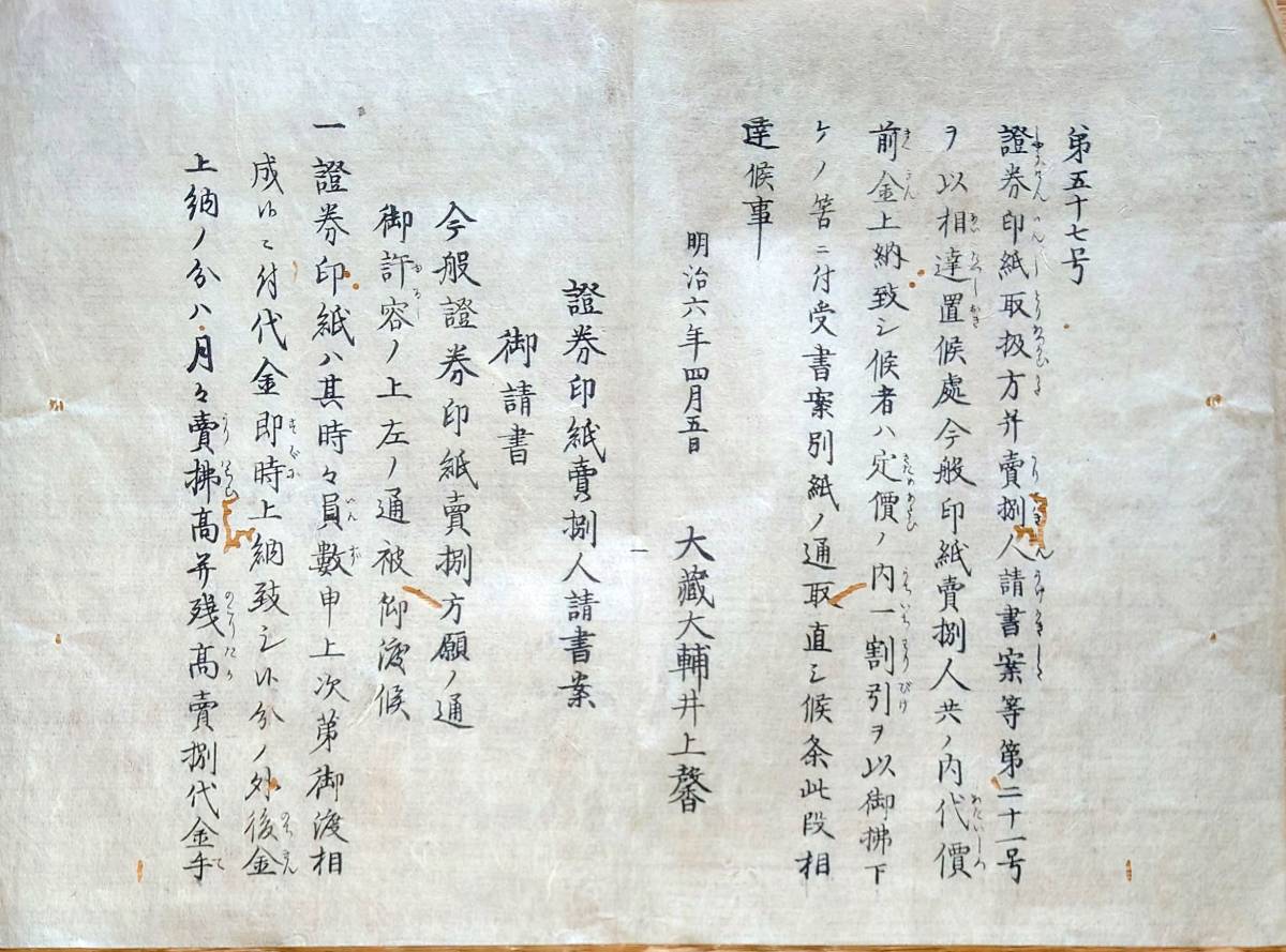 - f23022121〇明治布告布達 明治6年 神奈川県 大江卓 証券印紙売捌人請書案〇和本古書古文書