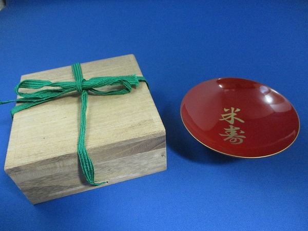- ★酒器 盃 米寿 木箱付 径10㎝ 高さ3.5㎝ ※裏に文字あり 木箱に汚れ・穴あり tm2302-22-5★