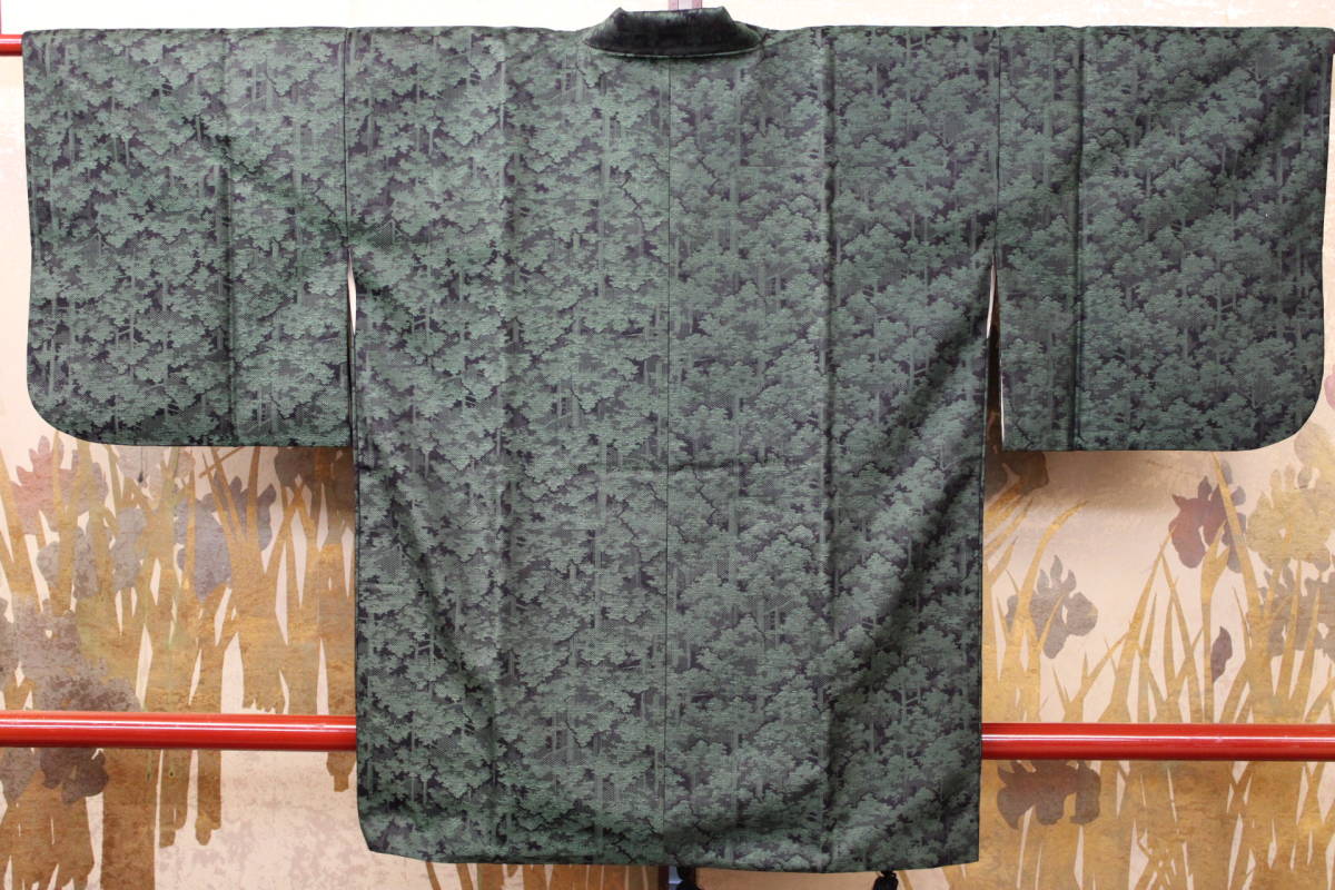 - きもの今昔4850 おしゃれコート 道中着広衿仕立て 黒地にグリーン樹木柄先染織柄