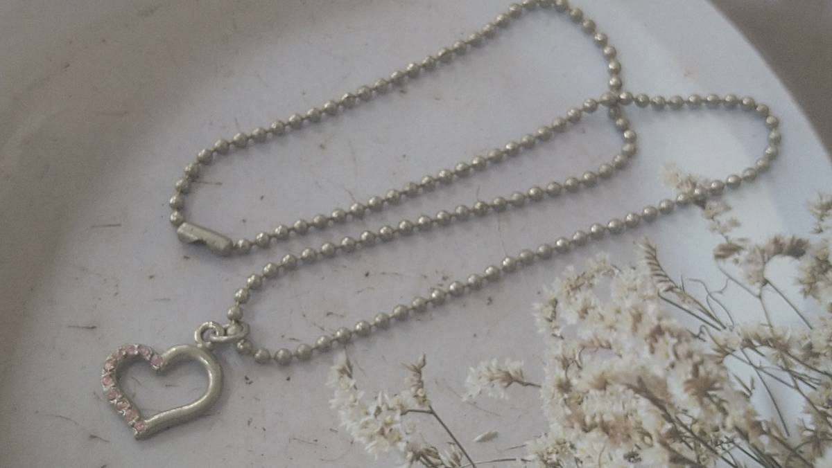 - くすみシルバーカラー・オープンハート×クリアピンク ボールチェーン ネックレス